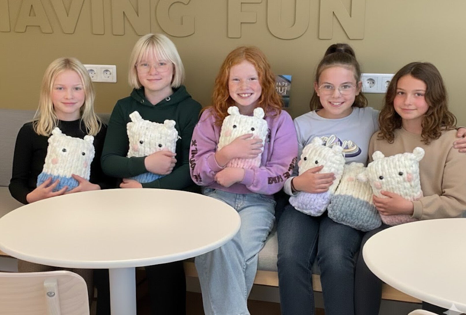 Maak met je handen een unieke, cute en heerlijk zachte knuffel in Kawaiistijl van puffy lusgaren. Grote tweekleurige versie vanaf 10 jaar, de iets kleinere in 1 kleur vanaf 8 jaar.